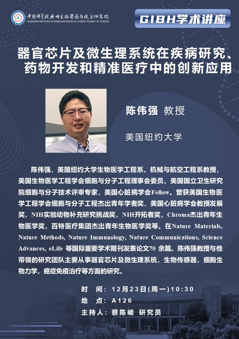 2024年12月23日學術(shù)講座:器官芯片及微生理系統(tǒng)在疾病研究、藥物開發(fā)和精準醫(yī)療中的創(chuàng)新應用