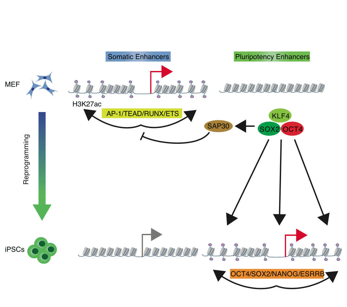 應(yīng)用ATAC-seq技術(shù)系統(tǒng)分析重編程過程染色質(zhì)開關(guān)圖譜,發(fā)現(xiàn)Sap30可以特異性的調(diào)控染色質(zhì)關(guān)閉狀態(tài)(2017,Cell Stem Cell)。