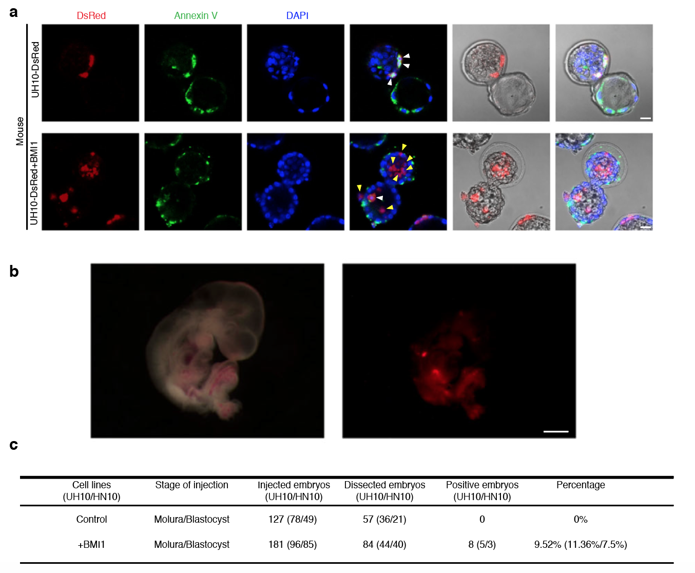 BMI1可以有效克服人多能干細胞在異種胚胎中發(fā)生的凋亡,進而促進異種嵌合(2018,Nature Communications)。