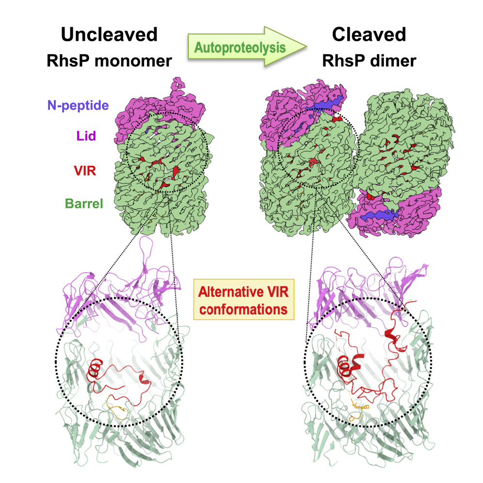 利用單顆粒冷凍電鏡技術(shù)首次揭示細菌分泌的毒素效應(yīng)蛋白RhsP自水解前后的構(gòu)象變化,并闡明二聚體的形成對于靶向獵物細胞有重要作用。(2022,Cell Reports)。