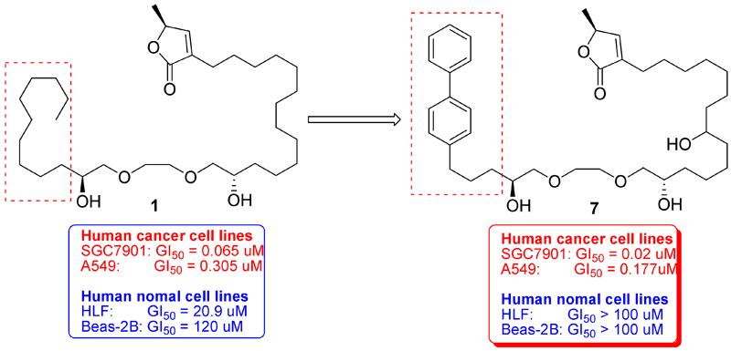 廣州生物院蔣晟研究員、南京大學(xué)姚祝軍教授和北京動物所周光飚研究員通過合理藥物設(shè)計,以廉價易得的乙二醇以及系列炔烴等為起始原料,首次構(gòu)建了系列具有構(gòu)象限制的乙二醇醚簡化番荔枝內(nèi)酯天然產(chǎn)物,其中具有聯(lián)苯基修飾的化合物7能有效抑制SGC7901腫瘤細(xì)胞的增長(GI50 = 20 nM),且具有更好的選擇性。