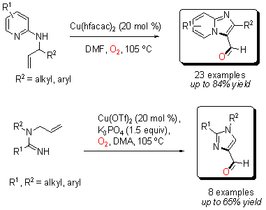 這一發(fā)現(xiàn)具有重要的學(xué)術(shù)價(jià)值:首先,該反應(yīng)在構(gòu)建雜環(huán)骨架的同時(shí),利用氧氣來源在雜環(huán)骨架上引入一個(gè)十分重要的官能團(tuán)---醛基; 其次,該反應(yīng)使用廉價(jià)低毒的銅催化劑、清潔的氧氣為氧化劑,反應(yīng)條件溫和;此外,該反應(yīng)具有很高的成鍵效率和氧化效率,從簡單易得的原料,一步得到醛基取代的芳雜環(huán)結(jié)構(gòu)。這一發(fā)現(xiàn)還有廣泛的應(yīng)用前景,使用該方法為關(guān)鍵步驟,可以高效地合成神經(jīng)系統(tǒng)用藥奈可吡旦Necopidem,總收率從以往的21%提高到50%。