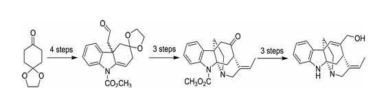 Minfiensine為裂環(huán)烯醚萜吲哚類生物堿,是從非洲馬錢子屬Minfiensis分離出來的。與其它馬錢子屬生物堿不一致的是,Minfiensine含有與燈臺屬生物堿(akuammiline alkaloid)類似的環(huán)己烷并四氫吡咯并吲哚骨架,最近研究表明燈臺屬生物堿具有重要的生物活性,其中包括抗癌活性。直到近幾年才有關(guān)于這類生物堿的全合成報道。