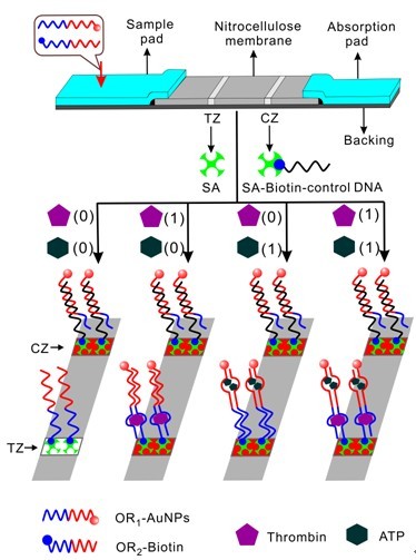 中科院廣州生物醫(yī)藥與健康研究院曾令文研究組模擬電子邏輯門運算機理,利用ATP和凝血酶為兩種輸入信號,依賴核酸適體作為分子識別元件,試紙條檢測卡是否出T線為輸出信號(有T線說明是陽性結(jié)果,有輸出信號;沒有T線說明是陰性結(jié)果,沒有輸出信號),成功構(gòu)建了基于核酸適體-靶分子自組裝生物分子邏輯門,用于小分子和蛋白的智能化快速檢測。