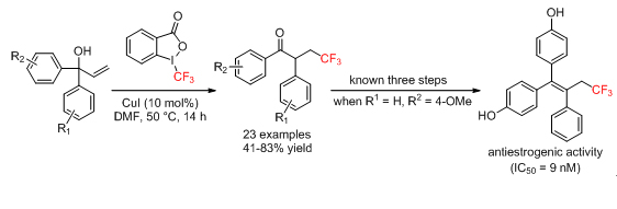 中科院廣州生物院吳筱星課題組與西安交通大學(xué)李鵬飛課題組合作,成功地實(shí)現(xiàn)了對(duì)a,a-二芳基烯丙醇的銅催化三氟甲基化誘導(dǎo)的1,2-芳基遷移反應(yīng)。并通過(guò)對(duì)不對(duì)稱(chēng)底物反應(yīng)的研究,闡明了該類(lèi)反應(yīng)是通過(guò)三氟甲基自由基的機(jī)理進(jìn)行的,從而為設(shè)計(jì)新型三氟甲基化反應(yīng)提供了重要的依據(jù)。此外,通過(guò)該方法能合成一系列其它途徑難以獲得的b-三氟甲基芳基酮化合物,并可用于制備具有顯著抗雌激素活性的化合物。目前,相關(guān)成果已被《德國(guó)應(yīng)用化學(xué)》雜志接收并在線(xiàn)發(fā)表(Angew. Chem. Int. Ed. 2013, 52, early view. DOI: 10.1002/anie. 201302673)。