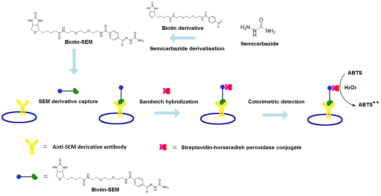 中科院廣州生物醫(yī)藥與健康研究院曾令文研究團(tuán)隊(duì)開發(fā)了一種簡潔、穩(wěn)定的氨基脲前處理試劑及方法,并建立一種基于夾心法的氨基脲小分子 ELISA 檢測方法,檢測靈敏度為0.07 μg /L,比常規(guī)方法提高10倍左右,足以滿足呋喃西林現(xiàn)場快速篩查需要。相關(guān)成果發(fā)表在Chem.Comm.上。