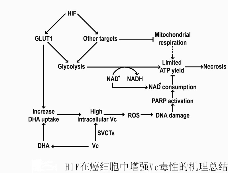 該研究團(tuán)隊(duì)以腎透明型腎癌細(xì)胞(CCRCC)作為腫瘤細(xì)胞研究模型,通過研究維生素C對(duì)腎癌細(xì)胞產(chǎn)生細(xì)胞毒性的機(jī)理,發(fā)現(xiàn)維生素C可以通過依賴低氧誘導(dǎo)因子(HIF)介導(dǎo)細(xì)胞死亡,且這一現(xiàn)象也被廣泛發(fā)現(xiàn)于其他癌細(xì)胞中。以此為切入點(diǎn)進(jìn)一步發(fā)現(xiàn),HIF陽(yáng)性的腎癌細(xì)胞可以通過腫瘤細(xì)胞普遍高表達(dá)的葡萄糖受體GLUT1在胞內(nèi)累積更多的維生素C,并與胞內(nèi)的鐵離子反應(yīng)產(chǎn)生更多的活性氧基團(tuán)(ROS),進(jìn)而誘發(fā)嚴(yán)重的DNA損傷。細(xì)胞對(duì)DNA損傷的修復(fù)會(huì)大量消耗胞質(zhì)內(nèi)的NAD+,由于HIF陽(yáng)性的腎癌細(xì)胞通過“Warburg 效應(yīng)”依賴低效率的糖酵解途徑獲取能量,其對(duì)NAD+驟降的緩沖能力較弱,細(xì)胞因此不可逆的走向了壞死。