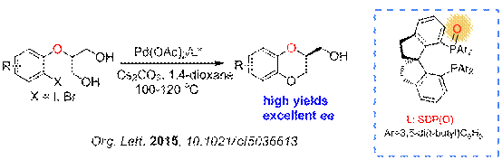 芳基醚和氧雜芳環(huán)是許多天然產(chǎn)物以及重要藥物分子中的關(guān)鍵結(jié)構(gòu)。過渡金屬催化的偶聯(lián)反應(yīng)是合成這類結(jié)構(gòu)的重要方法。盡管目前Pd催化的芳基C-O偶聯(lián)反應(yīng)取得了很大的進(jìn)展,但光學(xué)選擇性的芳基C-O偶聯(lián)反應(yīng)并未引起廣泛的關(guān)注。主要是因?yàn)檫@類反應(yīng)中,化學(xué)鍵形成于SP2雜化的芳基碳原子與氧原子之間,成鍵過程不直接涉及到中心手性的產(chǎn)生。并且對(duì)于Pd催化的C-O偶聯(lián)反應(yīng),特別是芳基鹵化物與一級(jí)或二級(jí)醇類化合物的偶聯(lián)反應(yīng),存在競(jìng)爭(zhēng)性的b-H消除以及脫鹵等副反應(yīng),使偶聯(lián)反應(yīng)的收率偏低,應(yīng)用受到很大限制。