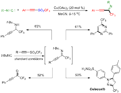 廣州生物院朱強(qiáng)博士與吳筱星博士合作,設(shè)計(jì)了異腈與三氟甲基炔基砜的反應(yīng),在異腈的末端碳原子上同時(shí)引入三氟甲基和炔基,得到相應(yīng)的構(gòu)型單一的酮亞胺。該反應(yīng)在醋酸銅的催化下,在0到15攝氏度的條件即能順利進(jìn)行,該方法操作簡(jiǎn)單,條件溫和,無(wú)需其它添加劑。初步的機(jī)理研究表明,異腈與銅鹽的共同作用,引發(fā)三氟甲基炔基砜裂解成三氟甲基自由基是反應(yīng)的關(guān)鍵步驟。反應(yīng)產(chǎn)物三氟甲基炔基亞胺具有多個(gè)反應(yīng)位點(diǎn),可以進(jìn)行多種類(lèi)型的后續(xù)化學(xué)轉(zhuǎn)化,如還原、共軛加成、水解、縮合環(huán)化等等。有些后續(xù)反應(yīng)可以不經(jīng)分離亞胺中間體,‘一鍋法’化得到結(jié)構(gòu)多樣性的含氟分子或雜環(huán)。例如利用該方法,一步就可以以53%的總收率得到抗炎癥藥物分子Celecoxib。