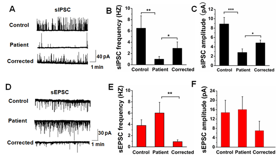 研究人員通過在iPS細胞水平上敲入紅色熒光蛋白基因來標記神經(jīng)元網(wǎng)絡(luò)中的GABA能神經(jīng)元亞型,首次在病人來源的神經(jīng)元網(wǎng)絡(luò)中對表達Nav1.1的神經(jīng)元亞型做了電生理檢測。同時,對網(wǎng)絡(luò)中自發(fā)抑制性及興奮性突觸后電活動進行了分析。研究發(fā)現(xiàn),突變c.a5768G(在外源性轉(zhuǎn)染體系中表現(xiàn)為無Nav1.1流)不僅影響表達Nav1.1的GABA能神經(jīng)元上Nav總電流幅度的大小,而且影響Nav的通道激活性質(zhì)。該變化進一步導(dǎo)致患者來源的神經(jīng)元網(wǎng)絡(luò)中的自發(fā)性抑制性突觸后電流(sIPSCs)減弱。雖然自發(fā)的興奮性突觸后電流(sEPSCs)無顯著性變化,但是,當(dāng)進一步分析sIPSCs和sEPSCs的頻率后,研究發(fā)現(xiàn),患者來源的神經(jīng)元網(wǎng)絡(luò)突觸后活動從抑制為主的狀態(tài)轉(zhuǎn)化為興奮性為主的激發(fā)態(tài),這表明,僅僅sIPSCs的變化就足以顯著逆轉(zhuǎn)神經(jīng)元網(wǎng)絡(luò)的興奮性水平?!?/p>