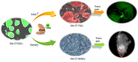 早期胚胎囊胚的組成包括胚胎干細(xì)胞(ESC)、滋養(yǎng)干層細(xì)胞(TSC)和原始內(nèi)胚層細(xì)胞(XEN)。賴良學(xué)課題組研究發(fā)現(xiàn),CRISPR介導(dǎo)的轉(zhuǎn)錄激活因子可有效啟動(dòng)ESC的內(nèi)源基因Cdx2和Gata6基因的表達(dá)。Cdx2是TSC的標(biāo)記基因,Gata6是XEN的標(biāo)記基因,兩者均不在ESC中表達(dá)。通過(guò)進(jìn)一步誘導(dǎo)實(shí)驗(yàn)發(fā)現(xiàn),通過(guò)調(diào)控這兩個(gè)內(nèi)源性基因的表達(dá),ESC可分別被直接誘導(dǎo)為胚外細(xì)胞TSC和XEN。通過(guò)標(biāo)記基因檢測(cè)以及體內(nèi)外分化實(shí)驗(yàn)證實(shí)這些誘導(dǎo)細(xì)胞具是有完全功能的細(xì)胞。該研究首次通過(guò)直接調(diào)控內(nèi)源基因表達(dá)實(shí)現(xiàn)早期胚胎細(xì)胞之間的細(xì)胞譜系轉(zhuǎn)換。隨著技術(shù)的進(jìn)一步成熟,以后還可用于替代細(xì)胞重編程技術(shù),使細(xì)胞命運(yùn)調(diào)控更加簡(jiǎn)單和安全。