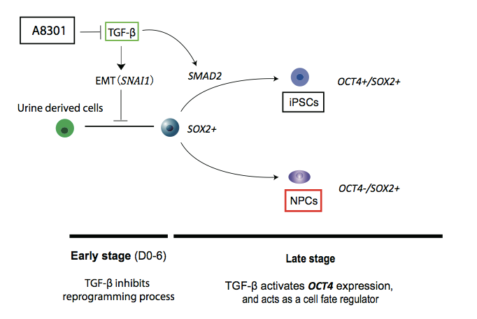 該研究基于潘光錦課題組已有的高效誘導(dǎo)尿液來源細(xì)胞重編程為神經(jīng)前體細(xì)胞的實(shí)驗(yàn)平臺(tái),研究了該過程中尿液來源細(xì)胞重編程為誘導(dǎo)多能干細(xì)胞(iPSC)或者神經(jīng)前體細(xì)胞(NPC)的命運(yùn)決定機(jī)制。該研究從四種小分子抑制劑中篩選出對于重編程過程最重要的因子A8301(TGF-β通路抑制劑),同時(shí)將誘導(dǎo)體系簡化。發(fā)現(xiàn)TGF-β在重編程早期(0-6d)可以誘導(dǎo)EMT相關(guān)基因SNAIL表達(dá),進(jìn)而誘導(dǎo)EMT,阻礙重編程,即抑制TGF-β通路可以提高重編程效率。而在重編程后期(6-18d),TGF-β可以誘導(dǎo)SMAD2表達(dá),進(jìn)而維持OCT4,NANOG基因的活化,促進(jìn)細(xì)胞完全重編程為iPSC,若后期缺乏外源性TGF-β刺激,克隆無法維持內(nèi)源性O(shè)CT4,NANOG基因的持續(xù)激活,因此,在內(nèi)部高水平SOX2基因作用下,克隆將轉(zhuǎn)分化為神經(jīng)前體細(xì)胞。