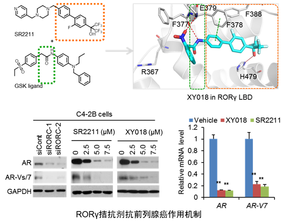 核受體是目前最為成功的藥物靶標(biāo)家族之一,在腫瘤、炎癥等方面的發(fā)生和發(fā)展過程密切相關(guān)。該研究發(fā)現(xiàn),除AR外,核受體成員RORγ對(duì)轉(zhuǎn)移性前列腺癌的進(jìn)展也起到關(guān)鍵作用。RORγ(不是RORα和RORβ)在轉(zhuǎn)移性腫瘤中高表達(dá),而且表達(dá)水平與腫瘤轉(zhuǎn)移程度密切相關(guān)。研究團(tuán)隊(duì)采用基于結(jié)構(gòu)的藥物設(shè)計(jì)方法,獲得的RORγ的拮抗劑XY011和XY018,通過抑制RORγ有效阻止AR基因和蛋白表達(dá)水平,從而抑制腫瘤生長。