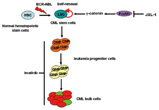 為了進(jìn)一步探究化合物JSL-1具體的作用機制,蔣晟課題組與中山大學(xué)潘景軒教授課題組合作,研究發(fā)現(xiàn)化合物JSL-1可作用于γ-catenin蛋白,而抑制γ-catenin可導(dǎo)致慢性粒細(xì)胞白血病屬的CD34+骨髓細(xì)胞中白血病干細(xì)胞的消失,該研究成果有利于深入了解組蛋白去乙?;敢种苿┛鼓[瘤的作用機制。