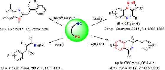 雜環(huán)化合物,尤其是含氮雜環(huán)化合物往往具有重要的生物活性,在藥物研發(fā)中具有重要的地位。發(fā)展高效的含氮雜環(huán)化合物的合成方法一直是有機合成研究的熱點。近年來,隨著過渡金屬催化和自由基化學的快速發(fā)展,異腈越來越廣泛地應(yīng)用到含氮雜環(huán)化合物的合成中。異腈作為一氧化碳的等電子體,在合成雜環(huán)化合物方面具有重要地位。通過設(shè)計官能化異腈來構(gòu)建雜環(huán)化合物近年來引起了科學家的廣泛關(guān)注。