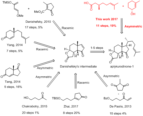 Aplykurodinone-1源于降解的海洋甾體,于2005年在Syphonota geographica海洋軟體動(dòng)物中分離得到。由于潛在的生物活性及其復(fù)雜的結(jié)構(gòu)特征,它引起了大量合成研究人員的研究興趣。截止目前,共有六個(gè)課題組報(bào)道了相關(guān)的研究工作。他們的策略各有特色,但都包含了Danishefsky路線中的關(guān)鍵中間體,導(dǎo)致手性控制不好,總產(chǎn)率偏低,合成效率不太理想。