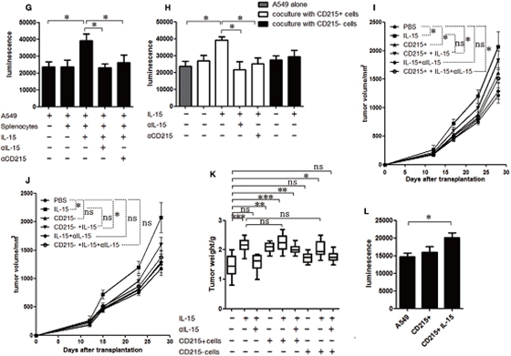 IL-15能有效地激活和維持T細胞、NKT細胞等活性,表現(xiàn)出促進免疫反應的功能,因而被廣泛應用于抗腫瘤治療的臨床研究中。然而,近年來也有部分研究指出,IL-15具有直接促進腫瘤生長的作用。該研究發(fā)現(xiàn)IL-15能促進肺癌異種移植模型(PDX,Patient Derived Xenografted)的腫瘤生長。 研究表明,PDX模型的腫瘤中存在一群髓系來源的CD215(IL15Ra) 陽性細胞,它們能夠對IL-15產生應答并促進肺癌生長。進一步研究發(fā)現(xiàn),對IL15產生應答的CD215+ 細胞能夠分泌IGF-1從而促進腫瘤細胞增殖。