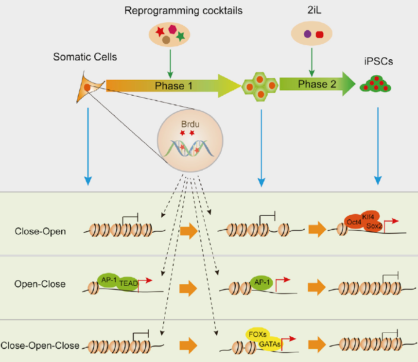 這些神奇的“魔法藥水”是如何將成體細(xì)胞誘導(dǎo)到胚胎發(fā)育早期的多能干細(xì)胞狀態(tài)的呢?裴端卿說,在個體中,所有的細(xì)胞都擁有同樣的染色質(zhì),為什么會形成形態(tài)各異、功能不同的各種細(xì)胞呢?原來,細(xì)胞在發(fā)生可識別的形態(tài)變化之前,就因受到約束而向特定方向分化,確定了其未來的發(fā)育命運(yùn)。團(tuán)隊(duì)研究發(fā)現(xiàn),細(xì)胞的命運(yùn)受到細(xì)胞核內(nèi)部的“信息中樞”染色質(zhì)的狀態(tài)控制。細(xì)胞染色質(zhì)的開放(1)與關(guān)閉(0)狀態(tài)總和,構(gòu)成了決定細(xì)胞命運(yùn)狀態(tài),這種情況就猶如計(jì)算機(jī)二進(jìn)制的“密碼串”,進(jìn)而將細(xì)胞“鎖”在了特定狀態(tài)。