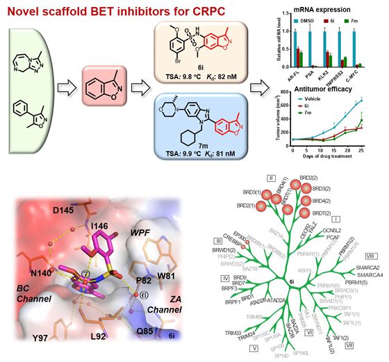 許永研究員團隊長期致力于創(chuàng)新藥靶發(fā)現(xiàn)與確證和創(chuàng)新藥物開發(fā)研究。團隊前期以前列腺癌耐藥等尚未滿足的臨床需求為導向,以計算生物學、藥物分子設計等理論策略為驅(qū)動,建立了藥物化學、化學生物學、結(jié)構(gòu)生物學等多學科交叉技術(shù)平臺。在此平臺基礎上,發(fā)展了苯并吲哚酮(Y02224,J. Med. Chem. 2016, 59, 1565-1579)和苯并噁嗪酮(Y08060,ACS Med. Chem. Lett. 2018, 9, 262-267)類BET溴結(jié)構(gòu)域抑制劑。近期,該團隊又開發(fā)了一類新型苯并[d]異噁唑類BET溴結(jié)構(gòu)域抑制劑,通過分子對接和復合物晶體結(jié)構(gòu)信息為指導,最終獲得了磺酰胺類和苯并咪唑類兩類高效的特異性BET溴結(jié)構(gòu)域抑制劑。這些化合物對前列腺癌等表現(xiàn)出良好的體內(nèi)外抗腫瘤活性。