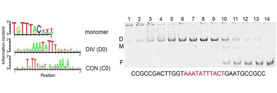 左圖顯示FOXA1同源二聚體結(jié)合基序(DIV),右圖遷移試驗(yàn)證明FOXA1能夠與DIV基序二聚化結(jié)合(D部分)