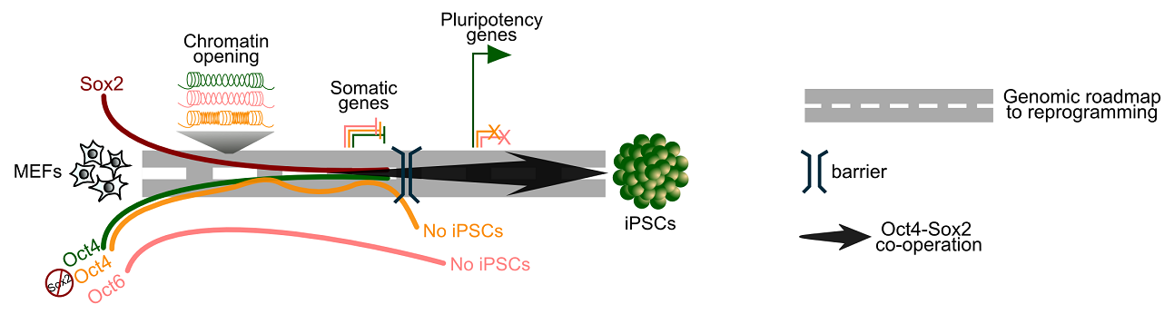 體細(xì)胞多能性重編程技術(shù)可通過使用重編程轉(zhuǎn)錄因子(主要是Oct4,Sox2和Klf4)將已分化體細(xì)胞轉(zhuǎn)化為誘導(dǎo)多能干細(xì)胞(iPSC),該技術(shù)于2006年首次發(fā)表,山中伸彌教授因此成果于2012年獲得諾貝爾生理學(xué)或醫(yī)學(xué)獎(jiǎng)。然而,該技術(shù)涉及的確切分子機(jī)制仍然有待研究。Jauch團(tuán)隊(duì)專注于研究Oct4和Sox2轉(zhuǎn)錄因子及其在重編程過程中如何發(fā)揮主導(dǎo)作用。通過利用基因組學(xué)技術(shù)比較野生型和突變體Oct4與Sox2的結(jié)合方式后,他們驚訝地發(fā)現(xiàn)Sox2而非Oct4是開啟體細(xì)胞重編程的關(guān)鍵因子。在重編程起始階段, Sox2“攻擊”和“喚醒” 體細(xì)胞中處于沉默狀態(tài)的多能性基因,這是激活它們的首要條件。Oct4在這一階段對體細(xì)胞特性的抑制并不重要,扮演著可有可無的角色。然而,為了最終打開相關(guān)的基因網(wǎng)絡(luò)以建立多能性,Sox2和Oct4緊密合作,共同完成這項(xiàng)工作。在重編程后期,Oct4逐漸起主導(dǎo)作用。一旦細(xì)胞變成多能干細(xì)胞,多能性的維持對Oct4與Sox2結(jié)合的依賴性大大降低。而Oct6因結(jié)合不同的基因組位點(diǎn),并且缺乏與Sox2結(jié)合的偏向性,因此不能取代Oct4進(jìn)行多能性重編程。這些發(fā)現(xiàn)解答了多能性重編程研究領(lǐng)域的一些爭議問題,將為改造Sox2,Oct4及相關(guān)因子以更快速,高效和可靠地進(jìn)行細(xì)胞重編程提供方向,為最終實(shí)現(xiàn)干細(xì)胞和再生醫(yī)學(xué)的臨床應(yīng)用提供可能。