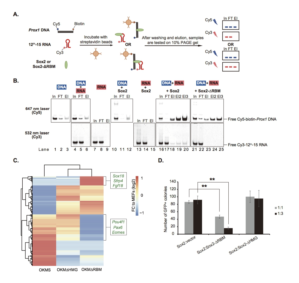 該研究通過(guò)PAR-CLIP和RNA SELEX的方法確認(rèn)了Sox2與RNA直接相互作用,進(jìn)一步的測(cè)序分析發(fā)現(xiàn)Sox2偏好性結(jié)合一個(gè)CCCY核心基序和一個(gè)CGCG的二級(jí)基序。隨后,研究人員利用EMSA和RNA免疫沉淀(RNA-immunoprecipitation assay)等手段確定了Sox2的RNA結(jié)合結(jié)構(gòu)域(RBM),該結(jié)構(gòu)域具有優(yōu)先結(jié)合富含GC的RNA序列的特征。另外,通過(guò)RNA fishing實(shí)驗(yàn)和競(jìng)爭(zhēng)性結(jié)合實(shí)驗(yàn)等進(jìn)一步分析, 發(fā)現(xiàn)在DNA和RNA共同存在的情況下,Sox2使用其HMG結(jié)構(gòu)域結(jié)合同源DNA序列,并同時(shí)利用RBM結(jié)構(gòu)域在體外介導(dǎo)三元RNA/Sox2/DNA復(fù)合物的形成。除此之外,通過(guò)比較Oct4、Klf4、c-Myc (OKM)“雞尾酒”以及不同Sox2突變體誘導(dǎo)下,誘導(dǎo)多能干細(xì)胞生成的效率發(fā)現(xiàn),刪除Sox2 的RBM結(jié)構(gòu)域會(huì)影響誘導(dǎo)多能干細(xì)胞生成,并且顯著地改變了體細(xì)胞重編程過(guò)程中的選擇性剪接事件。該研究加深了人們對(duì)Sox2蛋白調(diào)控多能性重編程機(jī)制的理解,進(jìn)一步闡明了DRBPs對(duì)RNA代謝的調(diào)控機(jī)制。