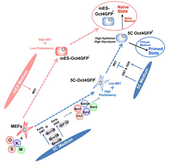 研究團隊利用新型培養(yǎng)基(5C 培養(yǎng)基)在成纖維細胞重編程的早期誘導EMT,并證明早期EMT可以有效促進多能性重建的過程。早期EMT可以有效促進細胞能量代謝模式由氧化磷酸化向糖酵解的轉變(OXPHOS-glycolysis switch, OGS);而在重編程早期利用小分子或者轉錄因子單獨誘導OGS也可以觀察到EMT。進一步的研究表明早期EMT與OGS通過下游關鍵轉錄因子之間的轉錄激活形成正反饋環(huán)路。在重編程早期,EMT和OGS通過下游關鍵轉錄因子共同激活一系列表觀遺傳調控因子,通過上調這些因子的表達進一步激活核心多能性轉錄因子的表達,有效促進多能性重建過程。研究團隊隨后在胚胎干細胞向肝臟細胞分化以及神經膠質細胞向神經細胞轉分化過程也分別驗證了早期EMT與OGS的相關性,以及兩者對上述表觀遺傳調控因子的調控作用。在重編程后期,EMT與OGS共同作用將細胞重編程到一個新的多能性狀態(tài)(5C state),基于公共數(shù)據(jù)庫中的數(shù)據(jù)集,也可以觀察到部分細胞具有與這樣的新多能干細胞類似的基因表達譜,提示EMT與OGS的正反饋作用可能在早期胚胎發(fā)育以及多能性調控中發(fā)揮重要作用。此外,鑒于上皮間質間轉換和能量代謝在腫瘤發(fā)生發(fā)展中的重要作用,這一研究成果或可以為腫瘤研究提供新的視角。