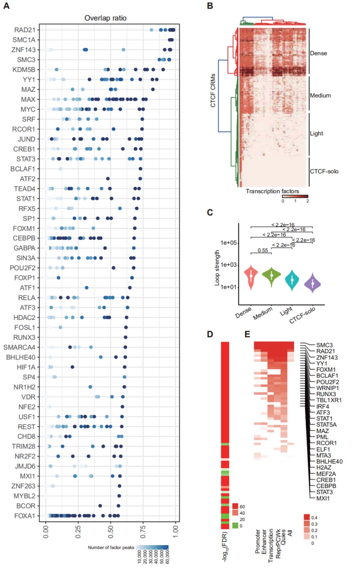 為了鑒定更多調(diào)控CTCF結(jié)合或CTCF介導(dǎo)的染色質(zhì)互作的轉(zhuǎn)錄因子,研究團(tuán)隊(duì)從尋找CTCF共定位因子的角度出發(fā),整合數(shù)據(jù)庫(kù)中所有高質(zhì)量的轉(zhuǎn)錄因子ChIP-seq數(shù)據(jù),系統(tǒng)性地篩選在基因組上與CTCF具有共定位的轉(zhuǎn)錄因子。然而轉(zhuǎn)錄因子和CTCF的ChIP-seq數(shù)據(jù)要在同一細(xì)胞、同一處理的前提條件下才具有可比性,但具備這種條件的轉(zhuǎn)錄因子ChIP-seq數(shù)據(jù)非常少。該團(tuán)隊(duì)利用CTCF在基因組上的結(jié)合具有保守性的特點(diǎn),通過(guò)整合大量細(xì)胞和組織中CTCF ChIP-seq數(shù)據(jù),首次鑒定出人超保守的CTCF結(jié)合位點(diǎn)。這些結(jié)合位點(diǎn)在絕大多數(shù)細(xì)胞和組織中都存在,可以與所有轉(zhuǎn)錄因子的ChIP-seq數(shù)據(jù)進(jìn)行比較,從而達(dá)到系統(tǒng)性篩選CTCF共定位因子的目的。通過(guò)這種方法,研究團(tuán)隊(duì)鑒定出多種已經(jīng)報(bào)道的與CTCF具有高共定位率的蛋白因子如ZNF143、KDM5B以及Cohesin復(fù)合物中亞基 RAD21、SMC3和SMC1A等,說(shuō)明了生物信息分析結(jié)果的可靠性。另外還鑒定出了多個(gè)之前未見(jiàn)報(bào)道的與CTCF具有高定位率的轉(zhuǎn)錄因子。