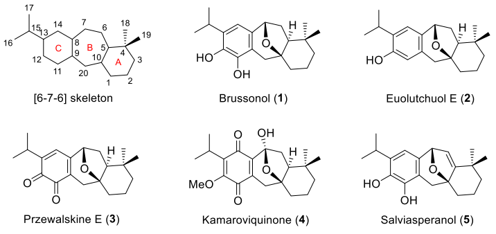 Icetexane二萜是一類具有[6-7-6]環(huán)系的天然產(chǎn)物。此類天然產(chǎn)物中包含有很多具有生物活性的化合物。例如此工作中所合成的Brussonol對P388鼠白血病細(xì)胞系有中等細(xì)胞毒性作用,同時(shí)對昆蟲和哺乳動(dòng)物細(xì)胞系具有細(xì)胞毒性。