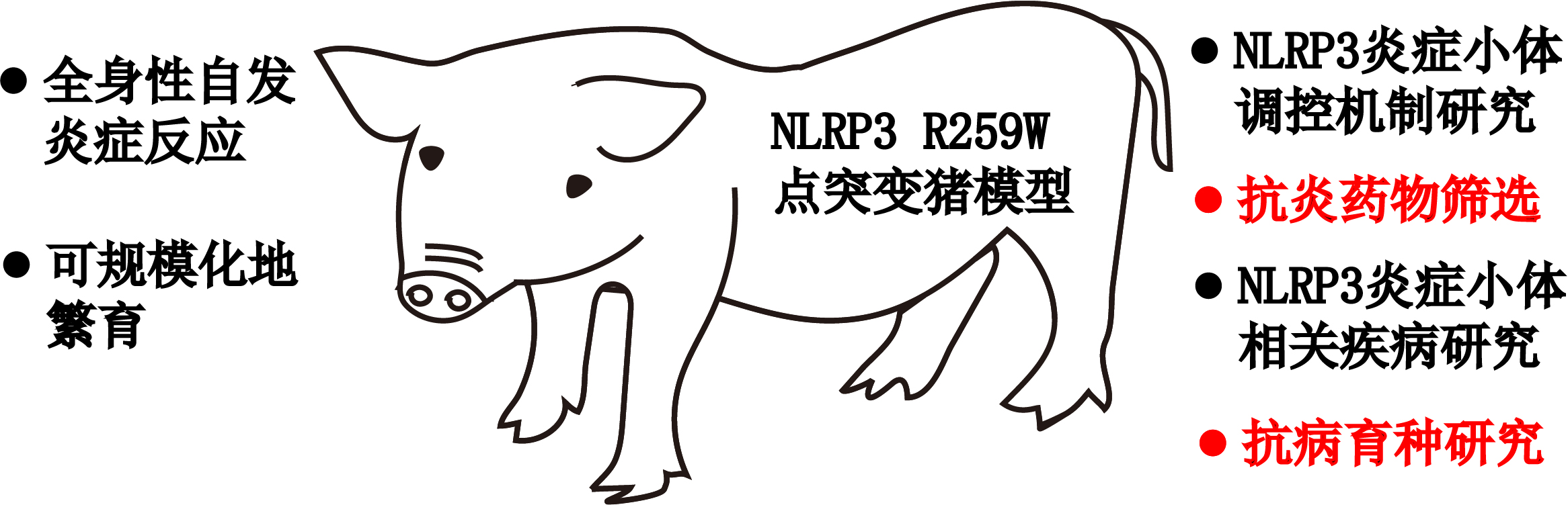 研究團(tuán)隊(duì)獲得的NLRP3炎癥小體激活增強(qiáng)豬模型,為抗炎藥物篩選提供理想的動物模型,同時也將為一系列NLRP3炎癥小體相關(guān)疾病,如家族性周期性自身炎癥反應(yīng)、2型糖尿病、阿爾茲海默癥和動脈粥樣硬化癥等的發(fā)生、發(fā)展機(jī)制研究提供工具豬模型;另一方面,該模型也為利用天然免疫對抗外來病毒/細(xì)菌提供研究工具,在抗病育種領(lǐng)域具有潛在的應(yīng)用價(jià)值。