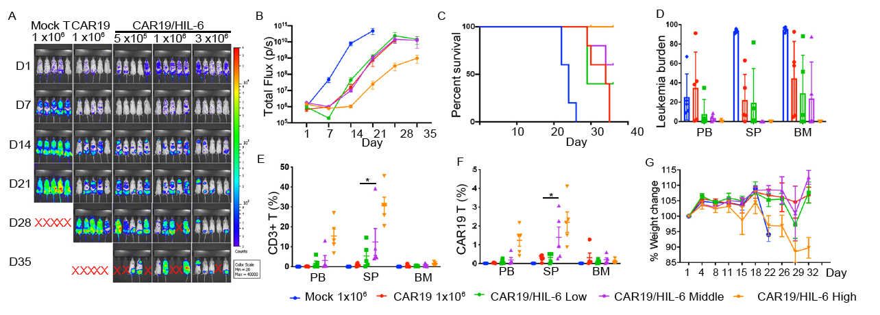 在本研究中,首先設計和構建了一種持續(xù)表達且激活IL-6跨信號的CAR-T細胞。在體外和異種移植腫瘤模型中,HIL-6 CAR-T細胞的增殖和抗腫瘤效果得到明顯增強,轉錄組分析結果表明CAR-T細胞在HIL-6的刺激作用下,上調了與T細胞遷移、早期記憶分化以及IL-6/GP130/STAT3相關的信號基因。動物模型進一步發(fā)現(xiàn),HIL-6 CAR-T細胞會引起嚴重的移植物抗宿主?。?/span>GVHD)及CRS,從而限制HIL-6 CAR-T 細胞的臨床應用。由于IL-6跨信號主要通過激活GP130信號通路,我們設計了一種能持續(xù)激活GP130的CAR-T細胞,結果顯示,在B細胞白血病和實體腫瘤的臨床前模型中,GP130 CAR-T細胞的增殖和抗腫瘤效果仍然明顯,且不會出現(xiàn)嚴重GVHD和CRS反應。以上結果表明了IL-6跨信號能顯著提升CAR-T抗腫瘤作用,而GP130 CAR-T 的臨床應用更安全。 同時提示在CAR T 細胞治療過程出現(xiàn)CRS時,不應過早使用抗IL-6R的中和抗體。
