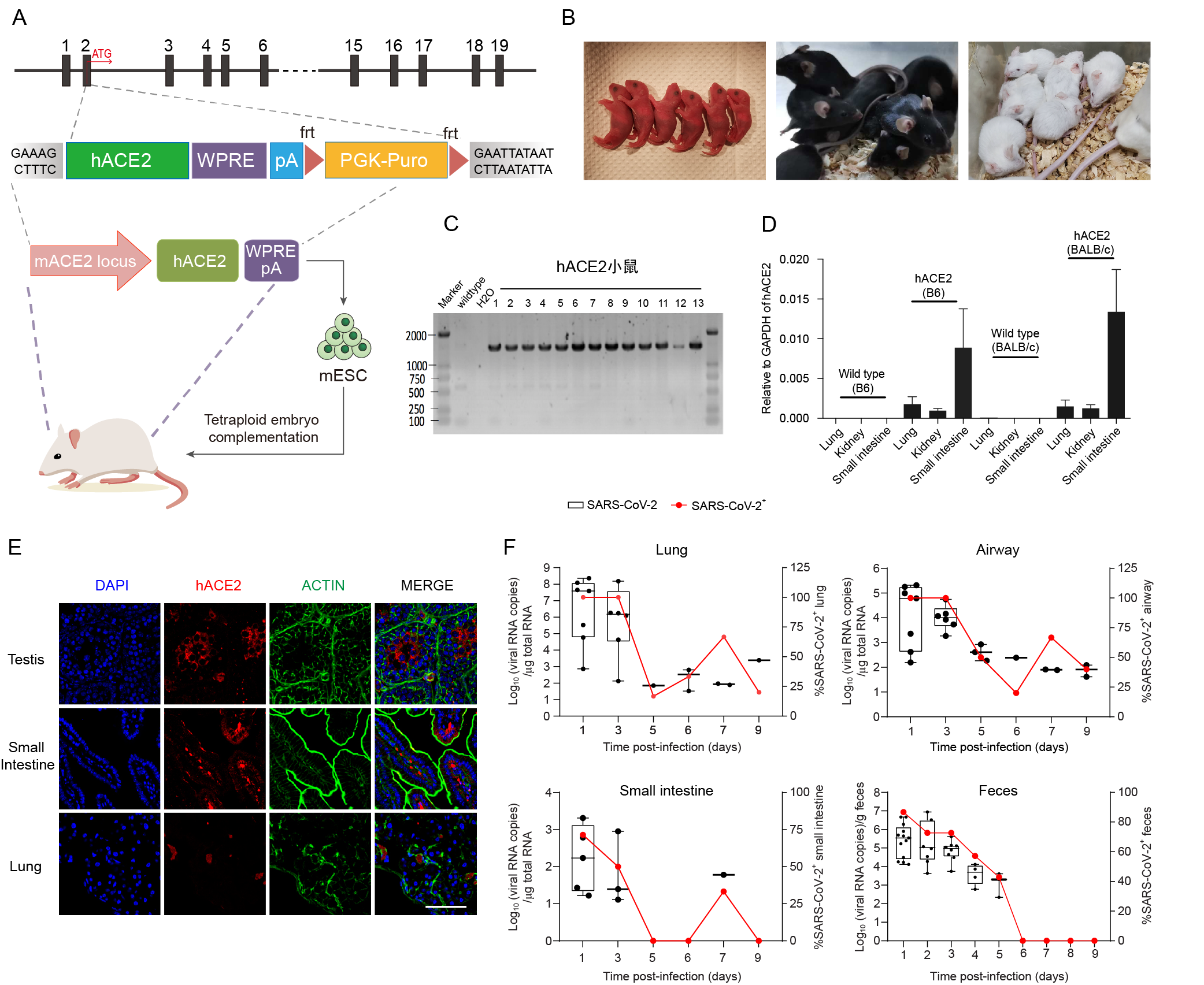 陳捷凱課題組有多年胚胎干細胞基礎(chǔ)研究與操作經(jīng)驗,能長期維持近交系胚胎干細胞的發(fā)育干性,并利用CRISPR-Cas9技術(shù)對小鼠胚胎干細胞進行人源ACE2定點插入基因編輯;吳光明課題組長期從事胚胎發(fā)育研究,在該報道中采用其優(yōu)化的小鼠四倍體補償技術(shù),快速制備出有效的C57BL/6 以及BALB/c近交品系的人源ACE2定點插入小鼠模型,且效率可達30%;鄭永唐課題組長期從事病毒免疫學(xué)以及感染動物模型研究。各團隊通力合作,將人ACE2基因原位敲入小鼠Ace2位點,制備了人源化ACE2小鼠模型,其表達模式正確,新冠肺炎病毒感染效率高并在糞便中檢測到病毒存在,可應(yīng)用于對中和抗體效果評價。
