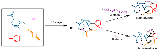 邱發(fā)洋課題組以(S)-Carvone作為手性源,以13步反應(yīng)合成了一個通用手性中間體,而該中間體是虎皮楠家族中許多成員的共同結(jié)構(gòu)特征。在此基礎(chǔ)上,可以通過組合化學(xué)模式合成多種結(jié)構(gòu)特征的虎皮楠生物堿。作為示范,邱發(fā)洋課題組從該中間體出發(fā),分別以3步和6步反應(yīng)實現(xiàn)了(-)-Daphenylline和(-)-Himalensine A的不對稱全合成。該全合成路線是(-)-Daphenylline分子的全合成中反應(yīng)步驟最少、產(chǎn)率最高的路線。