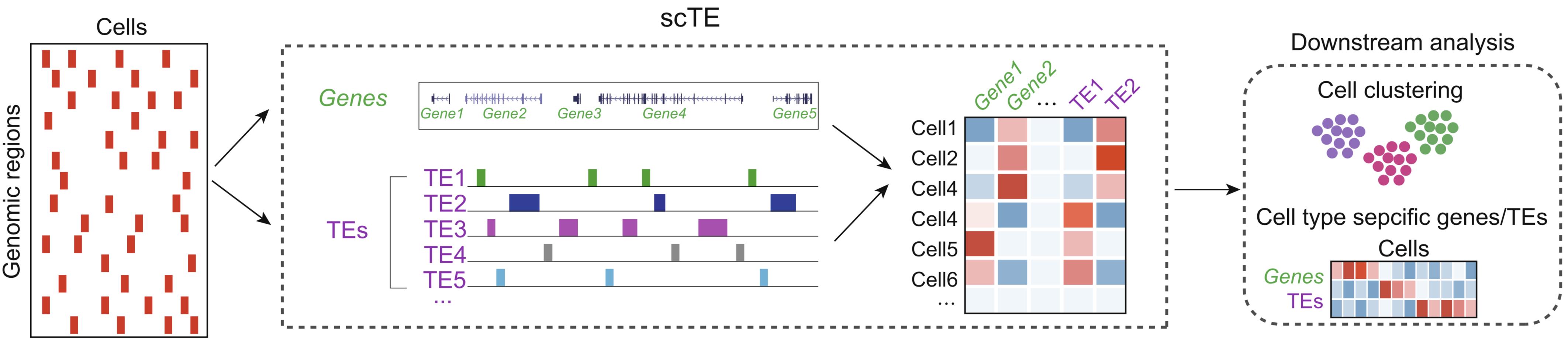 轉(zhuǎn)座元件(TEs)是人類基因組中含量最多的遺傳信息,是指一類能夠在基因組內(nèi)移動的DNA序列。TEs的插入和跳躍可以改變基因組遺傳信息,是物種進(jìn)化的重要原動力。盡管大部分TEs已經(jīng)喪失了“跳躍”的能力,成為了基因組中的“分子化石”。但近年來研究發(fā)現(xiàn),TEs可以通過影響染色質(zhì)表觀遺傳修飾、轉(zhuǎn)錄因子結(jié)合、RNA編輯以及染色質(zhì)構(gòu)象等,對基因表達(dá)起著非常重要的調(diào)控作用。單細(xì)胞轉(zhuǎn)錄組測序(scRNA-seq)是研究細(xì)胞命運狀態(tài)的絕佳技術(shù),近年來,更多的單細(xì)胞測序技術(shù)以及相應(yīng)的生物信息學(xué)分析方法也在不斷改進(jìn),總體的目標(biāo)是擴(kuò)展能捕獲的信息及挖掘能代表生物學(xué)功能的潛在維度。然而,目前從scRNA-seq數(shù)據(jù)分析的工具包都只定量基因的表達(dá),分析TEs的表達(dá)還比較困難,缺乏相關(guān)研究需要的生物信息學(xué)分析的工具包,因而忽略了基因組中含量最多的TEs來源的遺傳信息。