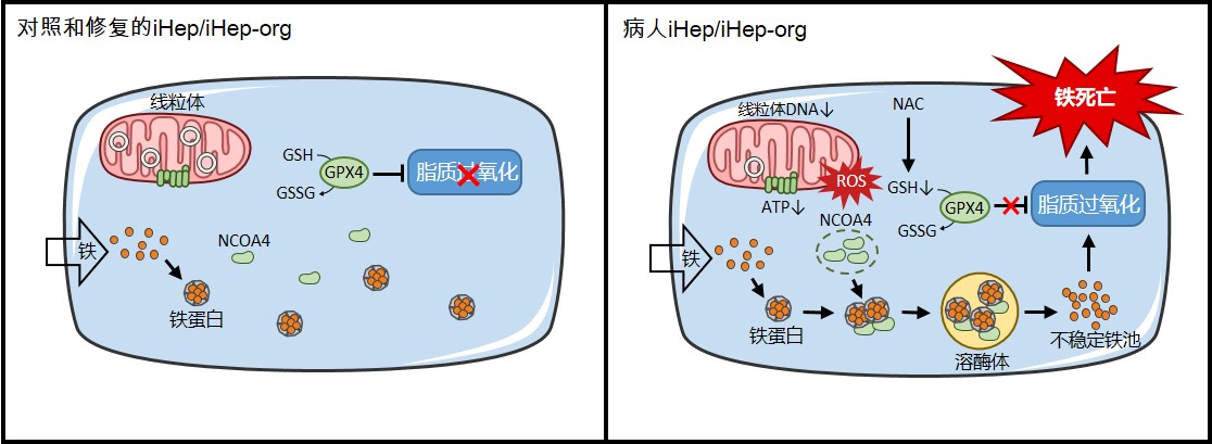 團(tuán)隊(duì)發(fā)現(xiàn)病人肝細(xì)胞線(xiàn)粒體DNA缺失導(dǎo)致線(xiàn)粒體功能障礙、ATP合成減少、和活性氧(ROS)大增。病人3D肝類(lèi)器官和2D肝樣細(xì)胞均對(duì)鐵沉積導(dǎo)致的鐵死亡更敏感。這一鐵死亡是線(xiàn)粒體與溶酶體的細(xì)胞器互作事件:首先線(xiàn)粒體活性氧激增及谷胱甘肽耗竭,繼而核受體共激活因子4(NCOA4)介導(dǎo)鐵蛋白在溶酶體中降解,鐵蛋白里的鐵釋放到胞質(zhì)中,引起脂質(zhì)過(guò)氧化增加,最終導(dǎo)致肝細(xì)胞鐵死亡。進(jìn)一步的工作篩選出谷胱甘肽的前體—N-乙酰半胱氨酸(NAC)可以顯著抑制病人肝細(xì)胞鐵死亡。