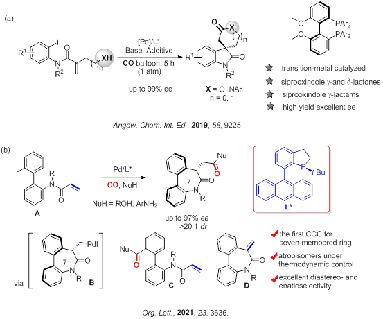然而,過渡金屬催化的不對(duì)稱羰基化反應(yīng)是羰基化領(lǐng)域的一個(gè)難點(diǎn)。這是因?yàn)橐谎趸伎梢宰鳛榕潴w與金屬中心發(fā)生配位,從而影響手性配體的調(diào)控。因此,過渡金屬催化的不對(duì)稱羰基化反應(yīng)是有機(jī)合成領(lǐng)域中一項(xiàng)非常具有挑戰(zhàn)性的課題。之前成功的例子主要集中在過渡金屬(Pt, Rh, Pd)催化的烯烴的氫羰基化類型的反應(yīng)上,這類反應(yīng)通常需要較高壓力的CO和H2,反應(yīng)條件比較苛刻,產(chǎn)物的結(jié)構(gòu)也比較單一。