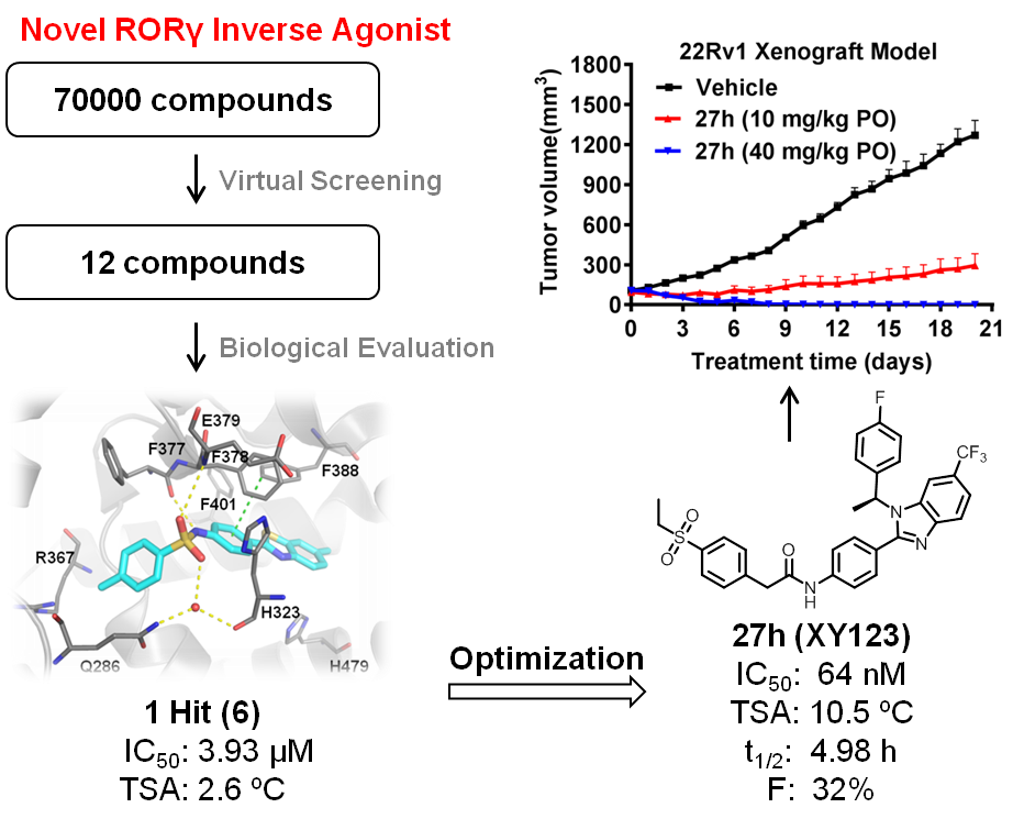 近期,該團(tuán)隊(duì)通過(guò)虛擬篩選、基于結(jié)構(gòu)的藥物設(shè)計(jì)和構(gòu)效關(guān)系研究,獲得了一系列苯并咪唑類RORγ小分子抑制劑,這些化合物對(duì)RORγ表現(xiàn)出顯著的抑制活性。代表性化合物XY123可有效抑制RORγ的轉(zhuǎn)錄活性(IC50 = 64 nM),增強(qiáng)RORγ-LBD的熱穩(wěn)定性(ΔTm = 10.5 °C)。同時(shí),XY123具有優(yōu)越的選擇性、良好的代謝穩(wěn)定性和藥代動(dòng)力學(xué)特性(t1/2 = 4.98 h,F = 32%)。另外,XY123也開(kāi)展了前列腺癌活性評(píng)價(jià)及克服耐藥機(jī)制研究。結(jié)果顯示,XY123可以抑制多種前列腺癌細(xì)胞的增殖與克隆形成,同時(shí)可有效抑制前列腺癌細(xì)胞中AR調(diào)控的下游基因的表達(dá)。XY123還可有效抑制前列腺癌細(xì)胞中AR全長(zhǎng)和AR突變體的表達(dá)。在22Rv1異種移植的前列腺癌小鼠模型中,通過(guò)口服給藥XY123可實(shí)現(xiàn)腫瘤的長(zhǎng)期完全消退。XY123可作為一個(gè)有前景的先導(dǎo)化合物用于前列腺癌及其臨床耐藥藥物的開(kāi)發(fā)。