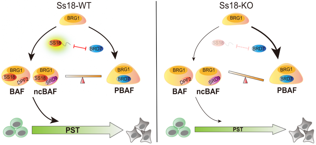 針對(duì)SS18的相分離行為是如何調(diào)控多能性退出的具體機(jī)制,科研人員進(jìn)一步展開(kāi)了深入的機(jī)制研究。已有研究表明SS18蛋白是染色質(zhì)重塑復(fù)合物BAFs的穩(wěn)定亞基。在胚胎干細(xì)胞中,BAFs主要分為三種亞型:經(jīng)典BAF(canonical BAF, cBAF)、非經(jīng)典BAF(non canonical BAF,ncBAF)以及PBAF(Polybromo-associated BAF)。他們含有一些共有成分如SMARCD1以及BCL7A/B/C等,也分別含有其特異性亞基??蒲腥藛T發(fā)現(xiàn),SS18形成的蛋白凝聚體可以富集cBAF特異性亞基而排斥PBAF特異性亞基,從而起到促進(jìn)或抑制相應(yīng)BAF亞型裝配的功能,而不同亞型的BAFs在多能性體細(xì)胞轉(zhuǎn)變中的角色卻不盡相同。因此,SS18蛋白的缺失會(huì)打破BAFs各亞型之間裝配的平衡,并最終影響多能性細(xì)胞-體細(xì)胞轉(zhuǎn)變進(jìn)程。