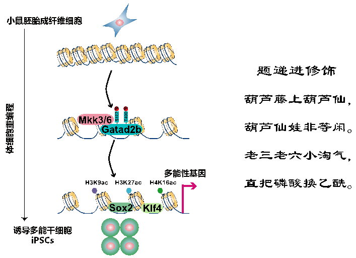 在經(jīng)典的激酶信號通路中,信號通過蛋白磷酸化傳遞;而在我們的最新研究中,發(fā)現(xiàn)信號可由蛋白磷酸化遞進傳遞到蛋白的乙?;?。我們發(fā)現(xiàn)二級激酶家族7個蛋白中MAP2K3/6可通過磷酸化Gatad2b進而調(diào)控組蛋白的乙?;?。這表明了不同的蛋白翻譯后修飾存在著“遞進修飾”的信號轉(zhuǎn)導(dǎo)新模式,并在多能干細胞命運調(diào)控中發(fā)揮著重要功能。這正像“葫蘆娃”七兄弟中的老三、老六,具有把磷酸化信號變?yōu)橐阴;盘柕摹斑f進修飾”特殊本領(lǐng)。
