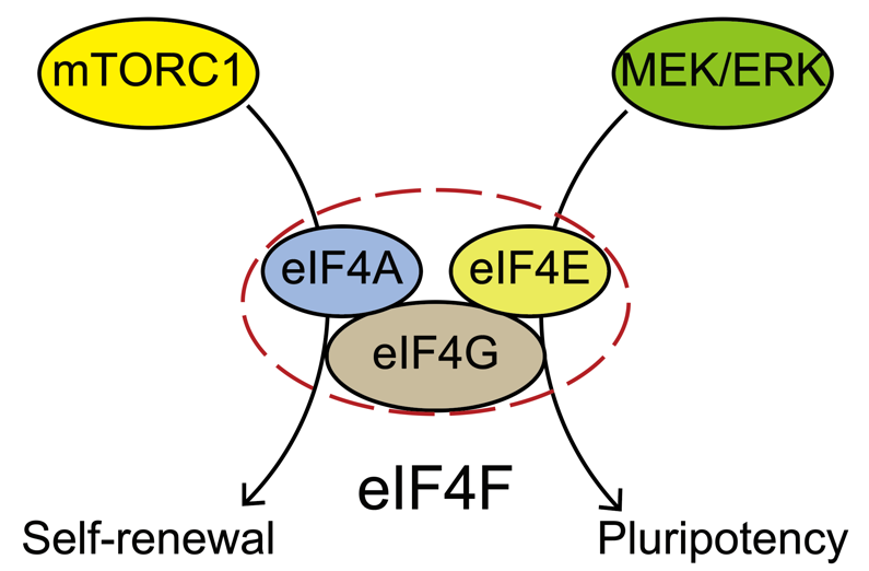 近日,中國科學(xué)院廣州生物醫(yī)藥與健康研究院秦寶明實(shí)驗(yàn)室揭示mTOR調(diào)控胚胎干細(xì)胞自我更新的新機(jī)制,相關(guān)成果以The mTORC1-eIF4F axis controls paused pluripotency為題于12月6日發(fā)表在EMBO Reports期刊。該工作中,研究人員發(fā)現(xiàn)mTOR調(diào)控mESC自我更新主要來自mTORC1的作用,具體機(jī)制與全基因組轉(zhuǎn)錄無關(guān),而主要通過翻譯起始復(fù)合物eIF4F(eukaryotic translation initiation factor 4F)協(xié)同調(diào)控細(xì)胞質(zhì)和線粒體的蛋白翻譯來實(shí)現(xiàn)。因此,內(nèi)源mTORC1在mESC中維持自我更新而不參與維持多能性。此外,該研究還發(fā)現(xiàn)在經(jīng)典的血清培養(yǎng)條件下,eIF4F還調(diào)控多能性蛋白的翻譯,這一作用依賴于MEK/ERK通路,而與mTORC1無關(guān)。