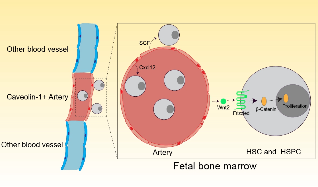 這項(xiàng)研究利用遺傳操作小鼠通過單細(xì)胞測(cè)序?qū)Ρ确治霭l(fā)現(xiàn),造血干細(xì)胞和骨髓微環(huán)境在胚胎期與成年期差異巨大,動(dòng)脈血管在胚胎骨髓中非常重要。在小鼠胚胎發(fā)育第16.5天,絕大多數(shù)造血干/祖細(xì)胞都位于動(dòng)脈血管旁。研究者發(fā)現(xiàn)此時(shí)的骨髓動(dòng)脈可以釋放Wnt2,動(dòng)脈來源的Wnt信號(hào)影響造血干/祖細(xì)胞的擴(kuò)增。而利用重組蛋白Wnt2在體外處理造血干/祖細(xì)胞,可以促進(jìn)造血干/祖細(xì)胞的增殖、增強(qiáng)造血干/祖細(xì)胞形成體外克隆的能力。