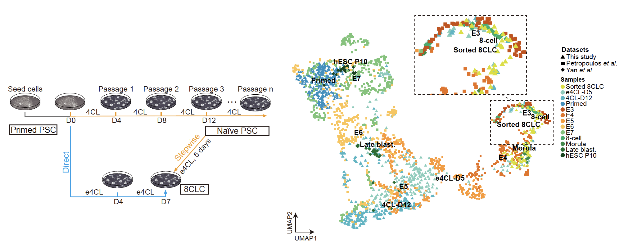 3月22日,中國科學(xué)院廣州生物醫(yī)藥與健康研究院Miguel A. Esteban研究組開發(fā)了一種非轉(zhuǎn)基因、快速且可控的重編程方法,將人多能干細(xì)胞(PSC)誘導(dǎo)為全能性的8細(xì)胞期胚胎樣細(xì)胞(8CLC),相關(guān)進(jìn)展以Rolling back of human pluripotent stem cells to an 8-cell embryo-like stage”題發(fā)表在Nature雜志上。研究人員運(yùn)用單細(xì)胞測(cè)序技術(shù),分析確定了8CLC與人8細(xì)胞期胚胎的高度相似性,描繪了轉(zhuǎn)化過程的關(guān)鍵分子事件和基因調(diào)控網(wǎng)絡(luò),并進(jìn)一步評(píng)估了8CLC的分化能力。