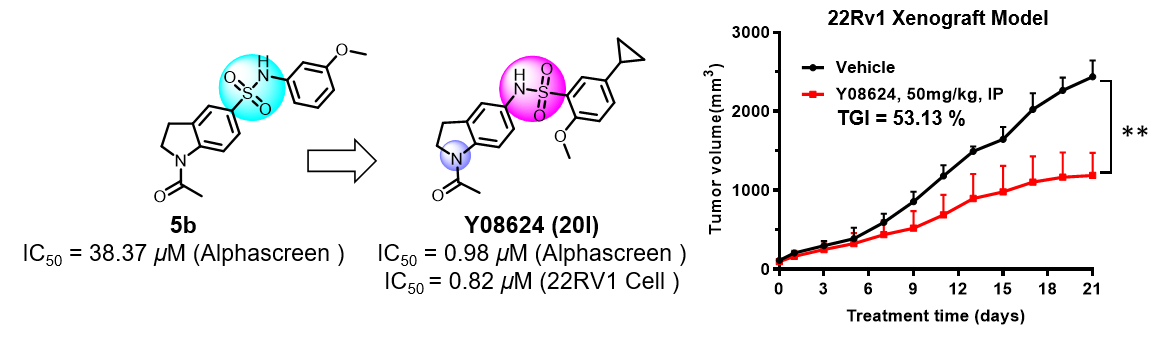 本研究結(jié)合虛擬篩選和基于結(jié)構(gòu)的藥物優(yōu)化策略,合成獲得了結(jié)構(gòu)新穎的先導(dǎo)化合物Y08624(20l)。化合物Y08624對(duì)TRIM24溴結(jié)構(gòu)域表現(xiàn)出較強(qiáng)的抑制活性(IC50 = 0.98 μM)和良好的選擇性?;衔?/span>Y08624可有效抑制多種AR陽性前列腺癌細(xì)胞的增殖,并抑制AR和AR調(diào)節(jié)的下游基因的表達(dá)。在22Rv1異種移植前列腺癌小鼠模型中,化合物Y08624可有效抑制腫瘤生長(TGI = 53%)。該研究為針對(duì)TRIM24溴結(jié)構(gòu)域的功能研究提供了優(yōu)秀的小分子探針,同時(shí)也為治療前列腺癌的藥物開發(fā)提供了新的先導(dǎo)化合物。