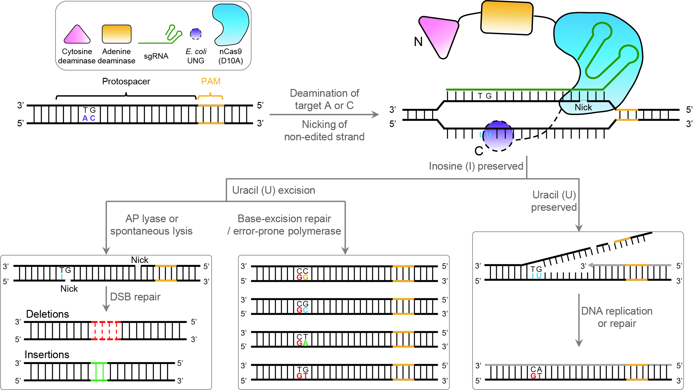 近年來,基因突變文庫構(gòu)建主要借助CRISPR/Cas9系統(tǒng)在目標(biāo)區(qū)域內(nèi)引入移碼突變破壞基因表達(dá),從而根據(jù)表型鑒定基因功能。這種方式也可以誘導(dǎo)基因SNV的產(chǎn)生,但是效率極其低下,不適合用于與基因SNVs相關(guān)的飽和突變文庫的高效構(gòu)建。David Liu實(shí)驗(yàn)室開發(fā)的堿基編輯器(BE)為飽和文庫的構(gòu)建帶來了技術(shù)上的突破。BE系統(tǒng)可以在基因特定區(qū)域引入高效的單堿基轉(zhuǎn)換,因此被迅速應(yīng)用于與DNA損傷應(yīng)答或癌癥相關(guān)的基因SNVs功能的高通量篩選等研究中,并取得了突破性的成果。但現(xiàn)有的BE只能實(shí)現(xiàn)一種或兩種類型的堿基轉(zhuǎn)換,不能滿足飽和突變文庫對編輯產(chǎn)物多樣性的需求,因此,亟需建立可以誘導(dǎo)多種類型堿基轉(zhuǎn)換的基因編輯工具。