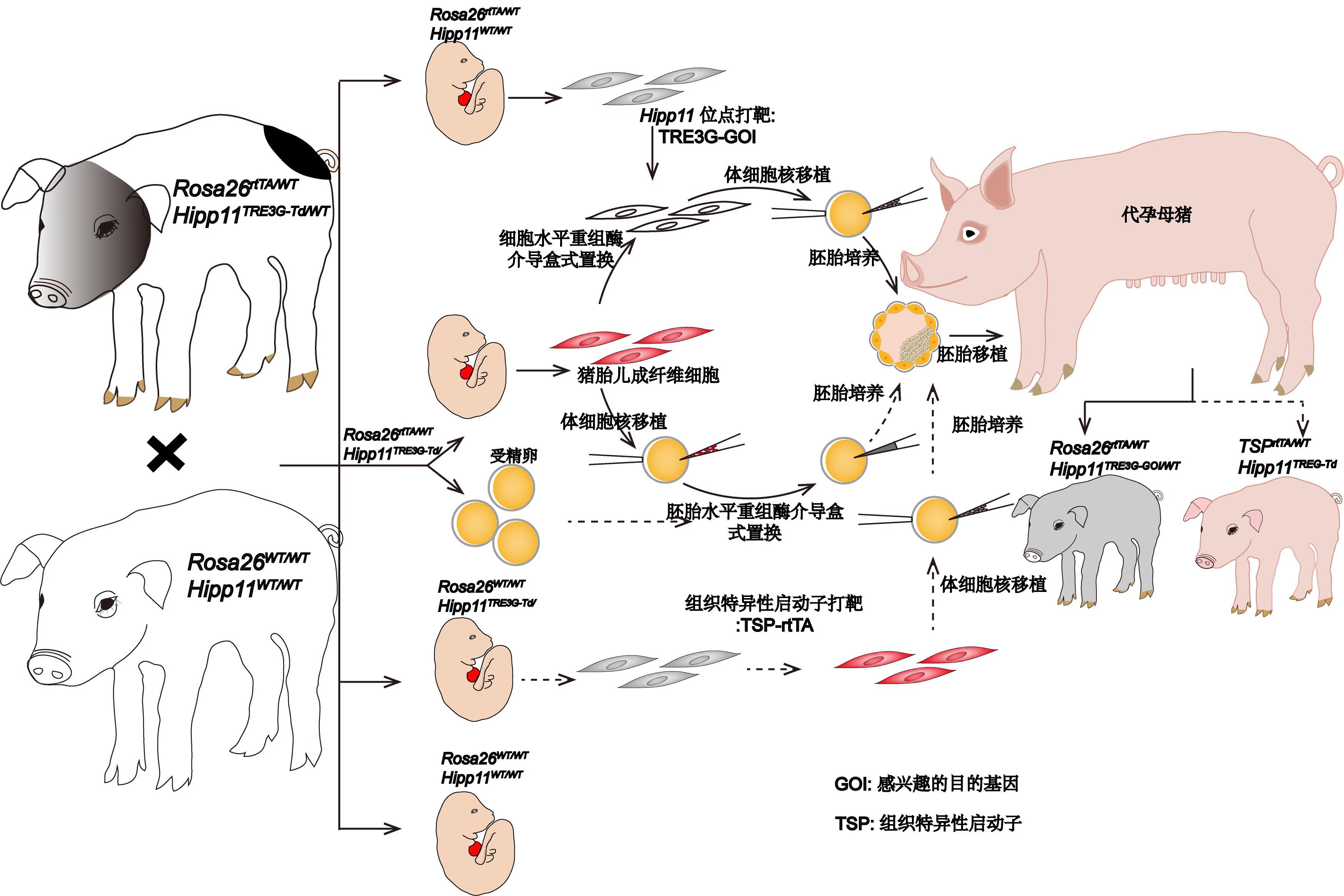 此外,可誘導表達外源基因工具豬,也是一種寶貴的基因資源,為后續(xù)建立各種用途的豬模型提供了極大便利。雙位點敲入豬遵循孟德爾遺傳定律,將Dox誘導報告基因表達豬與野生型豬交配擴繁,可獲得四種不同基因型(Rosa26rtTA/WTHipp11TRE3G-tdTomato/WT, Rosa26WT/WTHipp11TRE3G-tdTomato/WT, Rosa26rtTA/WTHipp11WT/WT和Rosa26WT/WTHipp11WT/WT)后代。例如,對于Rosa26rtTA/WTHipp11TRE3G-tdTomato/WT基因型豬,可以將細胞水平的重組酶介導的基因盒式置換與體細胞核移植相結合,培育Dox誘導目的基因表達豬模型;鑒于體細胞核移植低效且昂貴,而基因盒式置換在胚胎中非常高效,因此,也可以采用將phiC31 mRNA和供體DNA直接注射到源自Dox誘導報告基因表達豬群的受精卵的方法培育Dox誘導目的基因表達豬;對于Rosa26WT/WTHipp11TRE3G-tdTomato/WT基因型豬,可以通過由組織特異性啟動子控制的rtTA元件的單位點敲入,培育可用于譜系追蹤的組織特異性誘導報告基因表達豬模型;類似地,對于Rosa26rtTA/WTHipp11WT/WT基因型,可以通過單位點敲入TRE3G驅(qū)動目的基因表達盒,培育Dox誘導表達豬品系。