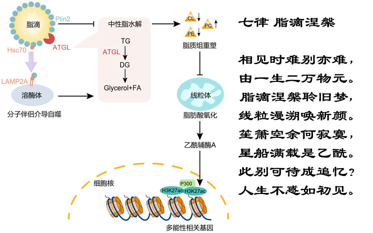 “輕輕的我走了,正如我輕輕的來(lái)”,多能性與脂滴一路陪伴,而多能性退出時(shí),脂滴也“涅槃”消失,起始分化為各胚層的發(fā)育進(jìn)程,正是“相見時(shí)難別亦難,由一生二萬(wàn)物元”。脂滴的消失,通過(guò)細(xì)胞器互作重塑線粒體磷脂組分與內(nèi)嵴重塑,正是“脂滴涅槃聆舊夢(mèng),線粒漫溯喚新顏”。 進(jìn)一步乙酰輔酶A通過(guò)組蛋白乙酰化加速多能性的退出,正是“笙簫空余何寂寞,星船滿載是乙?!薄_@一發(fā)現(xiàn)對(duì)于胚胎早期發(fā)育具有重要的生理意義,然而,當(dāng)人生到達(dá)“四十而不惑”的油膩中年,脂滴在肝臟、腫瘤、退化神經(jīng)等又重現(xiàn),這一發(fā)現(xiàn)同樣具有重要的病理意義,正是“此別可待成追憶?人生不惑如初見?!?nbsp;