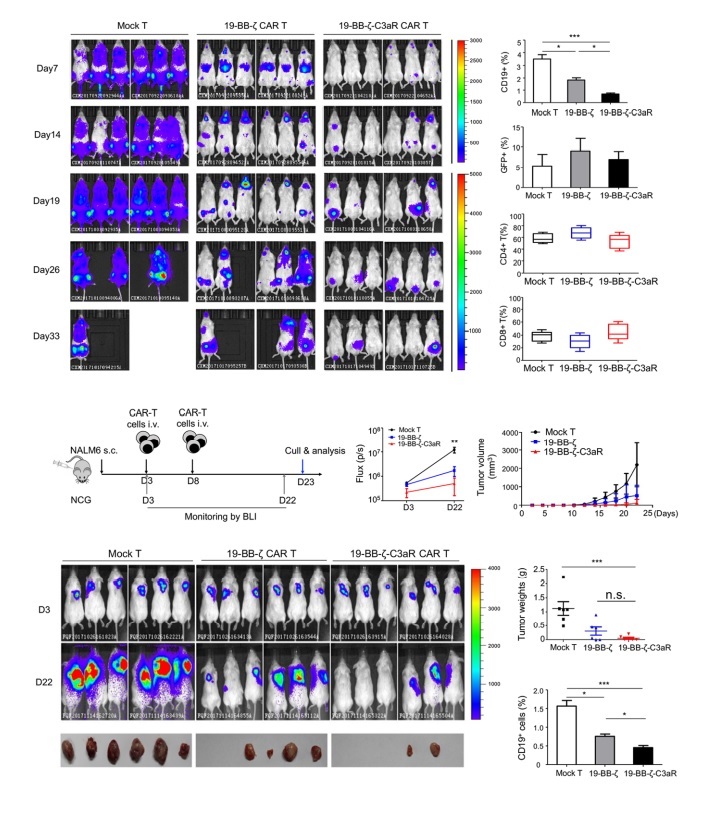 固有免疫和適應(yīng)性免疫的相互作用是人體免疫系統(tǒng)發(fā)揮功能的重要模式,借鑒和模擬這一模式,將固有免疫重要分子C3aR作為胞內(nèi)信號結(jié)構(gòu)域引入到CAR分子,將有可能使其發(fā)揮固有免疫和適應(yīng)性免疫的聯(lián)合效應(yīng),增強(qiáng)CAR-T的效能。因此本研究將C3aR活性結(jié)構(gòu)域引入CAR作為共刺激分子,構(gòu)建了新型BB-ζ-C3aR CAR-T細(xì)胞,分別針對表達(dá)CD19+和BCMA+的急性淋巴細(xì)胞白血病和多發(fā)性骨髓瘤進(jìn)行研究。體外和體內(nèi)實(shí)驗(yàn)結(jié)果表明,BB-ζ-C3aR CAR-T細(xì)胞的腫瘤殺傷效應(yīng)和持久性顯著提高。并進(jìn)行初步的機(jī)制探索,發(fā)現(xiàn)將C3aR引入為共刺激分子結(jié)構(gòu)域的新型CAR-T細(xì)胞可誘導(dǎo)腫瘤殺傷潛能的Th17細(xì)胞和記憶T細(xì)胞表型,發(fā)揮強(qiáng)效而持久殺傷的血液腫瘤作用。