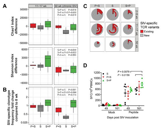 本研究結(jié)果發(fā)現(xiàn),預(yù)存瘧疾導(dǎo)致動物產(chǎn)生更多的CD4+ CCR5+ T細(xì)胞,有利于SIV的復(fù)制,從而導(dǎo)致更高的病毒載量。相反,隨后瘧疾感染誘導(dǎo)了更大比例的CD4+ CD28high CD95high中央記憶型T細(xì)胞和更強的SIV特異性T細(xì)胞反應(yīng),并維持SIV特異性T細(xì)胞受體庫的多樣性,產(chǎn)生新的SIV特異性T細(xì)胞克隆型來追蹤SIV的抗原變異,從而延長SIV感染動物的壽命。