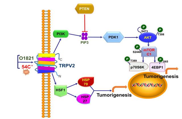 在機(jī)制上,TRPV2在ESCC細(xì)胞經(jīng)熱應(yīng)激激活后可上調(diào)細(xì)胞的熱休克因子1 (HSF1) 并促進(jìn)熱休克蛋白70和27 (HSP70/27) 的轉(zhuǎn)錄表達(dá),從而促進(jìn)ESCC的成瘤性;同時(shí)PI3K在此過程中顯著激活,進(jìn)而激活其下游信號(hào)蛋白PDK1,隨后PDK1上調(diào)靶蛋白AKT1和mTORC1的功能,反之,PI3K的負(fù)調(diào)控蛋白PTEN受到下調(diào)抑制,說明PI3K信號(hào)被PTEN放大,從而顯著促進(jìn)ESCC的成瘤性和侵襲力。激活的TRPV2還上調(diào)Akt 蛋白的S473和T308位點(diǎn)的磷酸化水平,而p-mTOR (S2448)和效應(yīng)蛋白磷酸化水平p-p70S6K (T389) 和p-4EBP1 (S65) 均相應(yīng)提升,而Tranilast的應(yīng)用或TRPV2基因敲除則抑制上述作用。