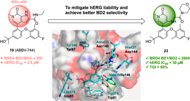 目前,已有許多pan-BET抑制劑被開發(fā)進入臨床試驗。然而第一代pan-BET抑制劑在臨床上表現(xiàn)出胃腸道毒性和血小板減少等劑量限制性毒性(DLT)。最新研究表明,第二代BD2選擇性BET抑制劑與泛BET抑制劑相比具有安全性改善的優(yōu)勢。艾伯維公司開發(fā)的第二代BD2高選擇性BET抑制劑ABBV-744的毒性低于泛BET抑制劑,并且在臨床前體內(nèi)模型中表現(xiàn)出穩(wěn)定的藥效。ABBV-744已進入臨床試驗用于治療AML和骨髓纖維化。然而,有專利披露ABBV-744以低微摩爾濃度(hERG IC50 = 3.1 M)抑制hERG鉀離子通道,有潛在的心血管疾病風險。因此,找到具有高BD2選擇性和更高安全性的BET抑制劑具有重要意義。